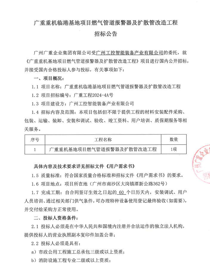 廣重重機臨港基地燃氣管道報警器及擴散管改造工程項目招標公告