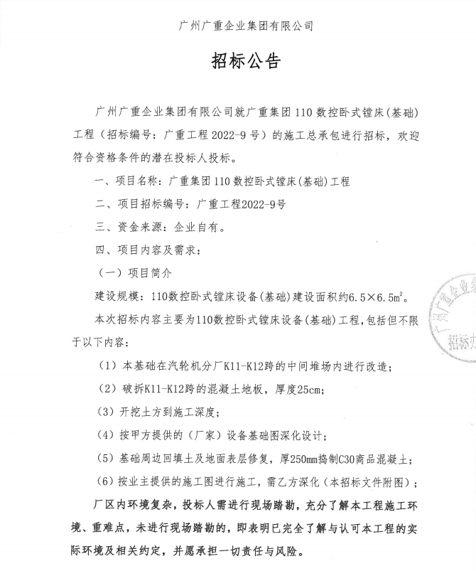 廣重集團110數(shù)控臥式鏜床(基礎)工程項目招標公告