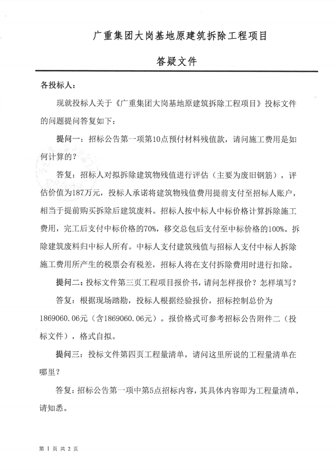 廣重集團(tuán)大崗一期原建筑物拆除工程項(xiàng)目招標(biāo)答疑公告