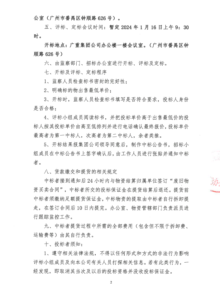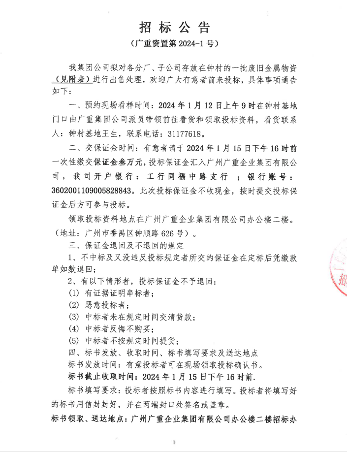 鐘村廢碳鋼A、割渣類等物資處置(廣重資置2024-1號)